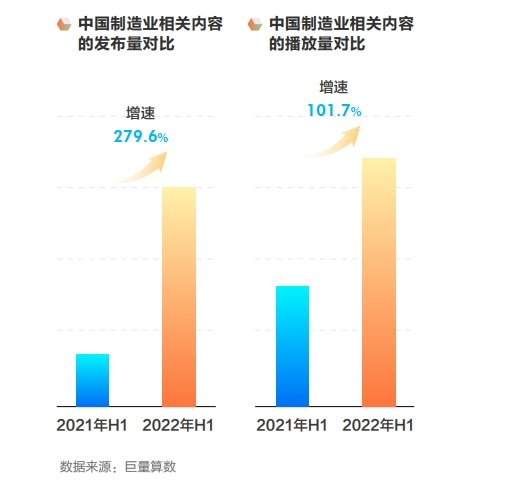 巨量算数数据显示,在抖音平台关于中国制造的视频发布量和播放量提升显著,创作者愿意在平台上发布中国制造相关内容,消费者也愿意在平台上关注此类内容,中国制造业规模实现线上线下的双增长。
