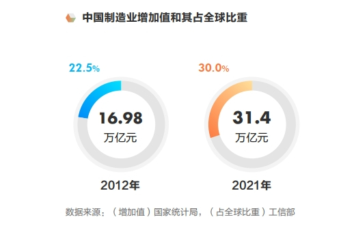 过去十年间,在政策扶持、技术创新等有利条件下,中国制造业开启了转型与升级的新篇章,规模优势不断巩固,体系优势更加凸显。2021年中国制造业增加值规模达到了31.4万亿元,占全球比重由2012年的22.5%提高至近30%。