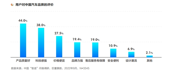 除新能源赛道外,技术层面的智能赛道更是汽车革命时代的核心。中国自主品牌通过合作和自研的模式,实现智能网联技术搭载,让“制造”变为“智造”,在用户的口碑中,认为中国汽车品牌“产品质量好”、“科技感强”的用户分别占据44.0%、38.0%,品牌逐渐实现从“低廉价格”到“高度智能”的转变。