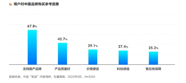 在用户选购中国制造品牌因素的TOP5中,“产品质量好”、“科技感强”等成为用户选购产品的主要因素,用户对于中国制造品牌的态度也由好感转为兴趣,到最后的实际消费行为。