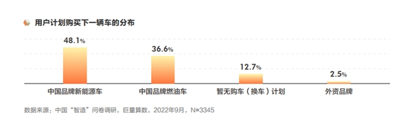 增长的背后,是用户对新能源车产品品质的认可,根据巨量算数调研问卷,用户对目前使用中的新能源车的评价中,“非常满意”的用户占比48.8%,并且在下一辆购车计划名单中,选择中国新能源汽车用户为48.1%,充分彰显对中国汽车品牌强烈的忠诚度。