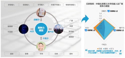 通过亿欧智库搭建的竞争力模型计算表明,百度输入法优势明显,在功能力、AI力、客户力方面均位居第一,个性力与搜狗输入法并列第一。