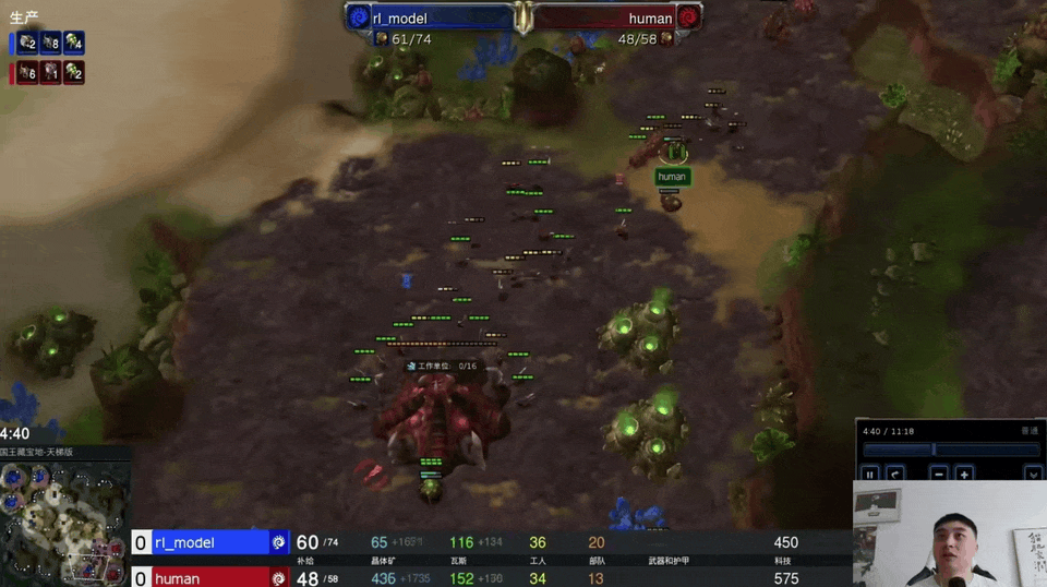 在集合整个团队的技术积累之后,历经人类录像模仿学习和自我博弈强化学习两个阶段,总计一亿局星际对局,五周的最终训练时间,2021 年 6 月,DI-star 终于战胜了 DI-star 的创造者之一——周航本人。之后,周航又拉来一些职业电竞时期的老朋友跟 DI-star 打,包括 MMR6000 分的中国最强虫族选手 Rex。