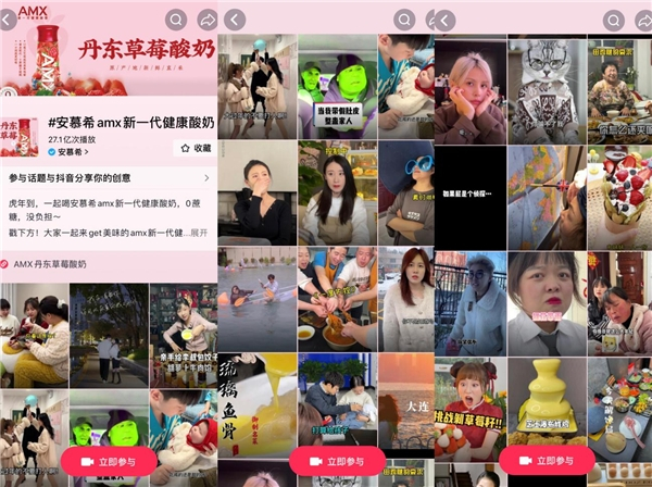 如何让季节性爆款产品成为“长红”产品?巨量云图捕捉到特殊时期大众宅家的生活场景,将安慕希AMX丹东草莓酸奶产品从“功能性”拔高为更深层的“情感陪伴”,结合“全dou快来吃”IP,打造了全民共创的内容玩法,在提升用户参与热情的过程中也提升了该产品在用户内心的陪伴价值,帮助品牌不断累积优质内容。