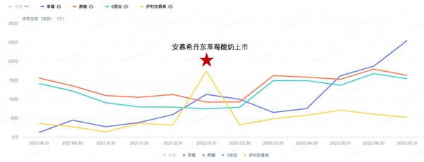 通过巨量云图商品洞察发现,安慕希丹东草莓酸奶在上市月的销售情况表现迅猛,随后在为期半年的时间里,成功激发了草莓口味、无蔗糖和0添加特征的酸奶产品持续的销售增长。品牌投放期间,草莓口味酸奶的销售额在行业中一直保持着领先位置,长周期的爆品关注度得以体现。