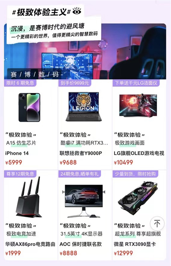 产品适不适合自己,只有体验过了才能知道,而京东电器打造的极致体验主义就是给所有沉浸式体验者的避风港。联想拯救者Y9000P搭载140W满功耗RTX 3060处理器,采用2.5K、165Hz电竞全面屏,支持智能三模显示切换,能带来极致电竞体验,现在购买到手价9688元,还可享6期免息福利。iPhone 14搭载A15仿生芯片,拥有超视网膜XDR屏、航空级铝盒金属、超瓷晶面板、车祸检测功能,最长续航20小时,京东售价5999元起,现在购买还可享6期免息。此外,LG旗舰OLED游戏电视、华硕AX86 Pro电竞路由器、AOC保时捷联名款、华硕ROG斯巴达鼠标等,也能带来更沉浸的体验,想体验赛博数码魅力的用户,千万不要错过。