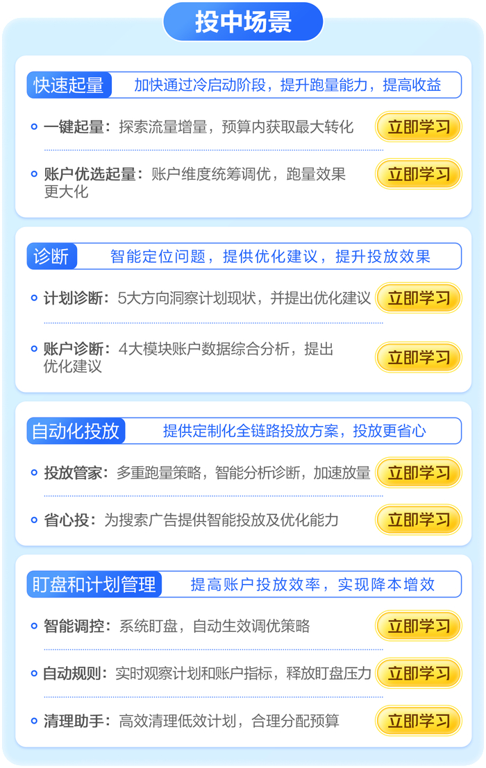 「投中优化」涵盖标准投放和自动化投放两类课程,优化师们借助“一站式”诊断定位投放中广告的问题与机会,利用起量、投放、调控等工具高效撬动流量,更有“投放管家”助力优化师们解放双手,释放盯盘人力,提高投放效果。