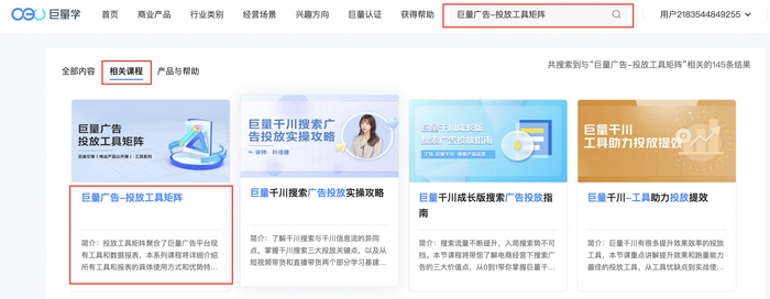 此套课程作为广告优化师们的“通关宝典”,帮助他们把握最佳投放时机,实时优化策略,复盘数据,全方位提升投放效果。现在,点击下方“阅读原文”即可免费获取投放工具图谱,学习课程;或进入巨量学官网,直接搜索「巨量广告-投放工具矩阵」,点击“相关课程”快速进入学习入口,随取随用,将所有工具“一网打尽”,开启广告投放进阶之旅!