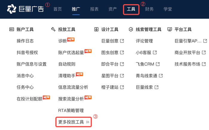 通关入口二:巨量广告 —> 投放工具 —> 更多投放工具