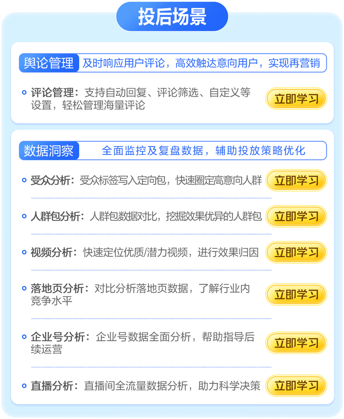 「投后分析」则细致拆解舆论管理和数据洞察两类工具的使用方法,帮助优化师们通过评论管理、分析投后积累的效果和互动数据,快速圈选高意向人群,提高对用户的理解,调整优化广告投放策略,并进行舆论管理和再营销。