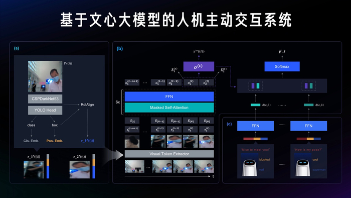 该技术基于文心大模型,结合注意力机制,对单个交互主体进行建模,提取时间、空间等维度信息,系统可以理解他们的行为、意图,然后引导机器人主动发出包含表情、动作、丰富话术的多模态交互,相比于之前的基于动作识别的端到端交互模型,能带给用户更加舒适、自然、友好的体验。
