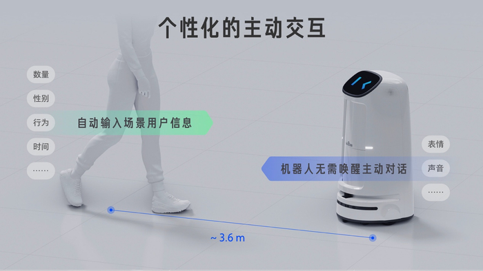 这种主动交互不是简单的、宽泛的交互,而是一种更加个性化的交互。TA可以根据时间、节日、客人典型的行为特征等发起不同的交互,千人千面。比如女神节的时候,会跟女性客人说“小姐姐,女神节快乐”;面对小朋友,直接上来唱“孤勇者”;面对佩戴会议标识的客人,主动说”欢迎大家来参会”等。