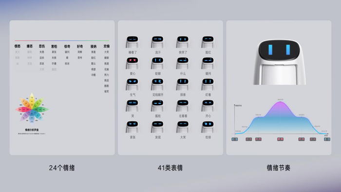 百度通过人脸表情识别和文本情感识别,提取情感信号的特征数据,准确识别人类的情感特征。依据Plutchik情感轮,对机器人情绪进行分类梳理,筛选出的24种情绪,设计出41类表情,结合富有节奏变化的动效设计,使得情绪表达更加生动有感染力。(例如,我们小度机器人在笑的时候,TA 从情绪酝酿到抒发,再到情绪高潮,细节捕捉是非常到位的。)建立情感应对机制,让机器人能够感知理解用户情绪,进而做出合理的情感反馈。