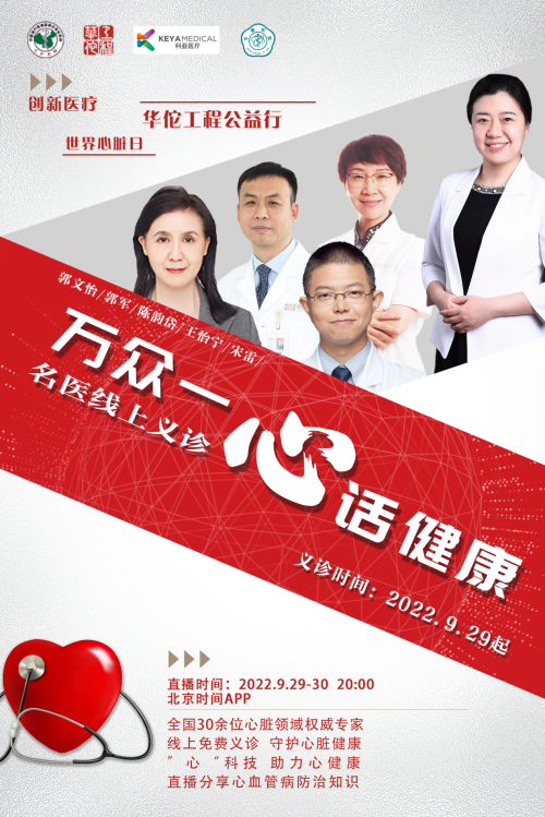 针对心血管疾病的现状,由中国医促会发起,中国医促会心血管病学分会、北京燕化医院承办,凤凰医疗集团协办,科亚医疗科技股份有限公司、北京电视台北京时间支持的华佗工程公益行一世界心脏日系列活动(万众一心“话健康”)将在2022年9月29日“世界心脏日”开展。本次结合今年世界心脏日“万众一心”的主题,届时将邀请全国三甲医院心血管内科、影像科30余位知名专家,利用互联网医疗及新技术对大众进行线上线下联合义诊,同时向全国大众进行心血管疾病相关知识科普直播,以改善心血管疾病知晓率、治疗率、控制率低的现状,促进大众健康。