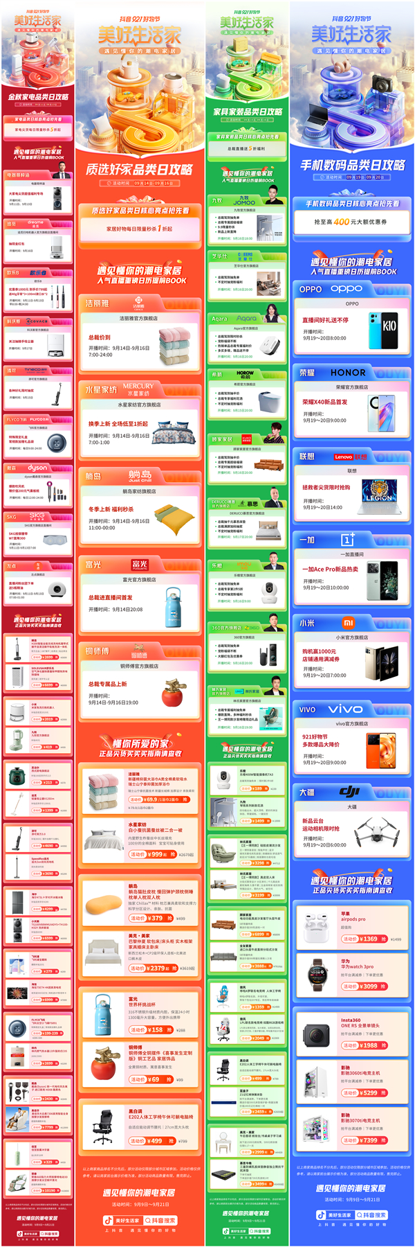 围绕典型居家场景,抖音电商消费电子家居生活行业在921活动中,以家用电器特色品类日、质选好家特色品类日、家居家装特色品类日、手机数码特色品类日4个主题品类日活动,为消费者打造了一个集“内容+电商”为一体的场域,让消费者能装点品质生活,同时获得美好的内容体验。
