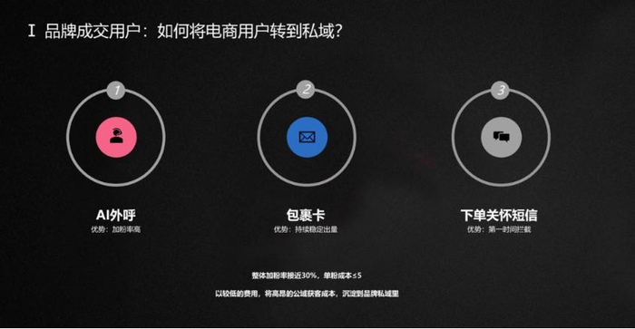 2、将电商用户转到私域的三种方式:AI外呼,优势是加粉率高,因为电话属于深度沟通;包裹卡,加粉率不高但是可以持续稳定出量;短信,下单之后关怀短信,打开率比较高。加粉率30%+,单粉成本<5元。因为电商用户是投入比较高的费用从公域获取的,所以要把前端的流量承接到私域池中。