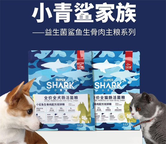 小青鲨的鲨鱼肉蛋白质含量达22%,脂肪含量3.2%,与普通鱼类相比是真正的“高蛋白、低脂肪”的优质肉源,富含氨基酸及多种微量元素。以鲨鱼肉为食材主体的小青鲨原切冻干系列、小鲨鱼生骨肉双拼系列产品被称之为“好吃不胖”系列,备受消费者好评。在严苛的生产标准下,“高蛋白低脂肪”的鲨鱼肉营养得以保留,科学的益生菌及营养素添加,既有效减轻宠物消化代谢系统的压力,又可以降低毛孩子高龄时因肥胖产生并发症的概率。