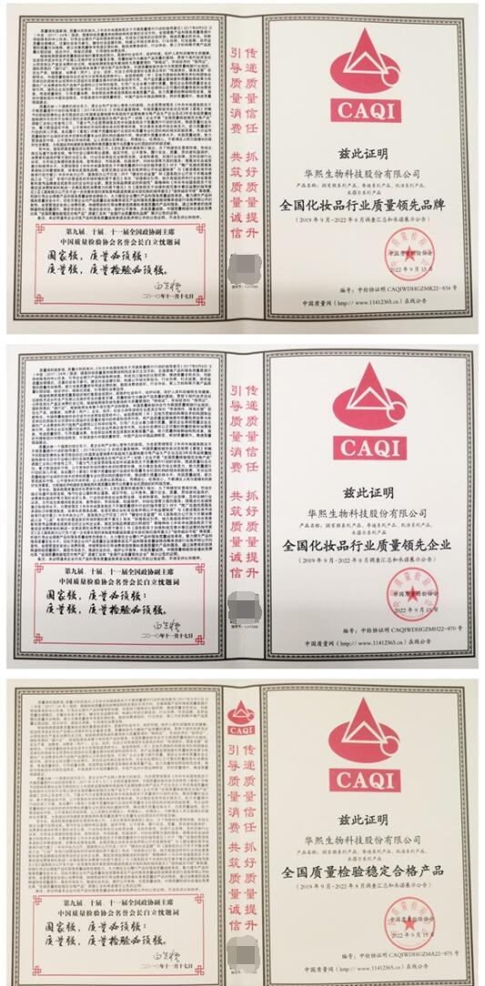 华熙生物荣获“全国化妆品行业质量领先企业”、“全国化妆品行业质量领先品牌”和“全国质量检验稳定合格产品”三项殊荣。一次斩获三项国家级质量荣誉充分肯定了华熙生物高标准、高水平的质量管理体系建设。