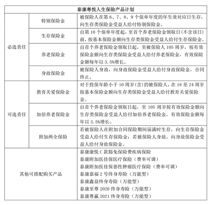 为助力长寿时代下的风险保障和财富规划,泰康人寿推出了《泰康尊悦人生年金保险产品计划》,保险责任丰富,投保方式灵活。