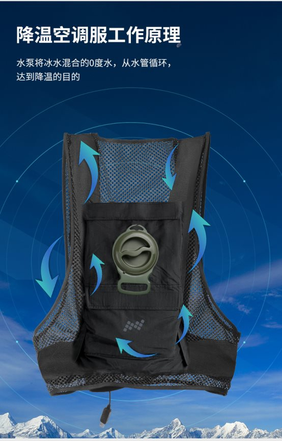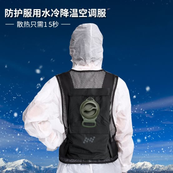 原来,这是慧指感专门为户外工作者研发的一款可以自动降温的防疫服专用空调服。空调服中安装了一个小巧的水泵,水泵可以将冰水混合到0度水,从水管进行循环,为衣服内部输送源源不断的冷风,以达到长时间降温的作用。