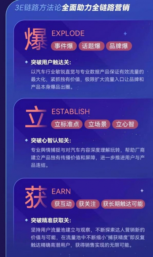 综合来看,3E链路营销是基于汽车行业各链路环环相扣的特点,从各个链路入手,深入影响用户各环节的决策——在前期链路,要通过Explode实现品牌出圈,触达最大量级的精准用户;在中期链路,用好Establish,立标准,立场景,以有限的信息传递精准价值,影响用户心智;在后期链路,要专注于Earn,通过流量池的长期蓄水,在链路后端反复触达高潜用户,最终实现精准用户的决策转化。