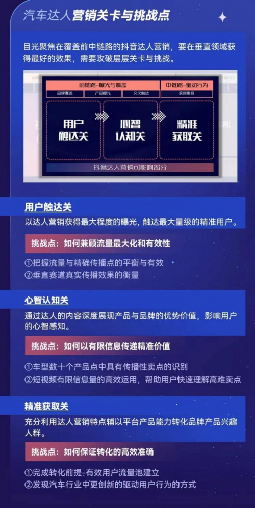 而今天的达人营销已从早期在前链路的传播价值,后探到影响中后链路,兼具对有效用户的收集与获取,成为汽车厂商实现更有效传播的新路径。但由于汽车行业达人营销有着与众不同的超长链路,想在垂直领域取得更好效果,需要攻破汽车达人营销的三道关卡:用户触达关卡、心智认知关卡、精准获取关卡。