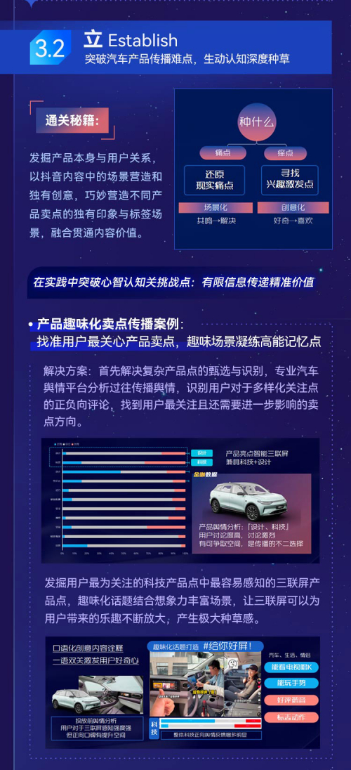 以零跑汽车为例,它通过Establish的思路发掘了用户最关注的三联屏产品点,通过趣味化话题打造了“给你好屏”,结合丰富场景,放大三联屏可以为用户带来的乐趣,实现了用户心智层面的打透,科技感正向反馈明显增多。