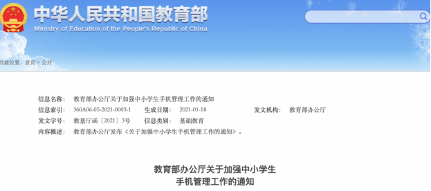 2021年,教育部办公厅曾发布关于“加强中小学生手机管理工作”的通知,称“为保护学生视力,让学生在学校专心学习,防止沉迷网络和游戏”,将对手机入校加强管理、引导、督导和检查。”
