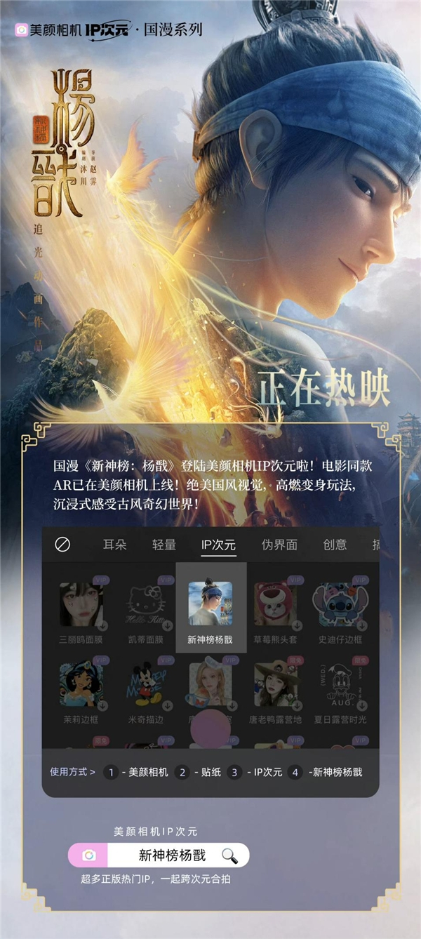 “IP次元”的构建,背后是美颜相机App年轻潮流化的品牌概念。通过多元IP的跨界合作,平台始终占领着趣味自拍潮流引领者的高地。按IP素材系列上新包装的思路,以每周主推的IP人物维持活动热度;结合重要时间节点,策划主题的玩法活动,有效告知用户美颜相机多样的功能及授权素材;通过明星、素人多维度的体验参与和社交媒体反馈,扩大活动影响力;以多平台、多媒体的传播内容结合限时折扣,吸引潜在用户成为VIP用户。近期美颜相机IP次元·国漫系列,跨界合作超高人气国漫电影《新神榜:杨戬》,在未来,还会有更多热门卡通人物陆续加入美颜相机的“IP次元”。