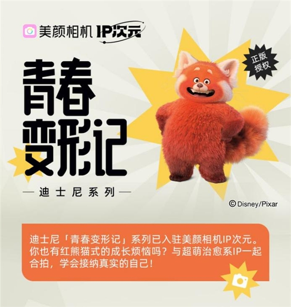 9月,皮克斯出品的动画电影《青春变形记》,影片中蓬松软萌的红熊猫充满治愈感,获得了广泛喜爱。美颜相机与迪士尼强强联手,将该IP引入了“IP次元”中,在给美颜相机用户带更高体验感的同时也为《青春变形记》带来了更高的曝光量以及全新的互动方式。