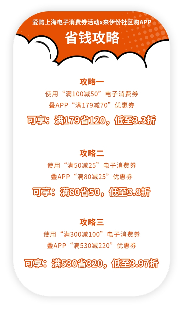 更有心的小伙伴,还研究出了折上折的攻略:在来伊份社区购APP下单,享爱购上海优惠叠加。比如使用“满100减50”电子消费券,叠APP“满179减70”优惠券,可享“满179省120”,相当于低至3.3折。