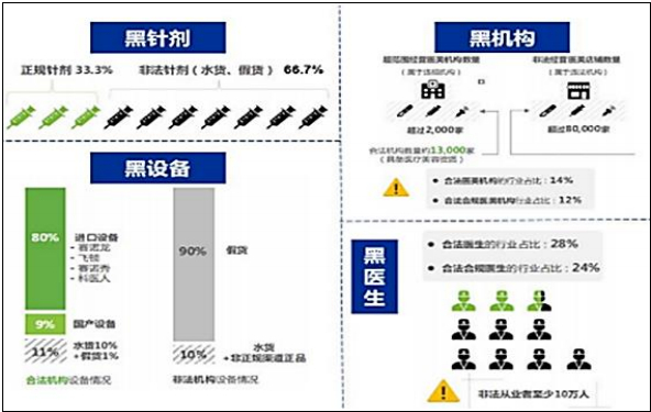 张宠女士(智美颜和轻医美品质连锁品牌创始人、CEO)指出:行业发展必须要把规范和品质作为企业经营的第一要素。在医美行业上游实际掌握核心技术和原料的企业能获得超额利润。但在中下游,由于竞争激烈,很多入局者走上了歪路子——“黑医美”。中国黑诊所(不能提供营业执照和医疗机构职业许可证的医美机构)数量已超60000家,是正规诊所的6倍。