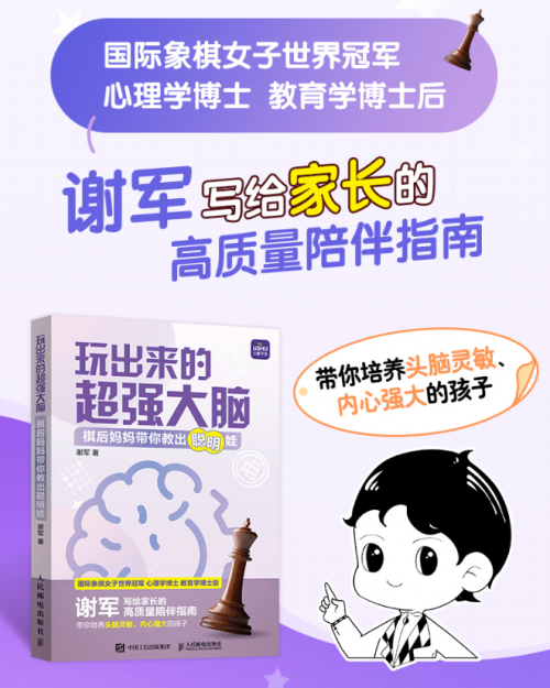 身为棋后妈妈,谢军还为众多棋童家长倾情编写了高质量陪伴指南——《玩出来的超强大脑 棋后妈妈带你教出聪明娃》,帮助家长在顺应孩子爱玩天性的同时,最大化激发孩子的多元天赋潜能,引导孩子兼顾学业与特长,培养头脑灵敏、内心强大的孩子,并分享成为“好心态”家长的智慧,和孩子一起成为更好的自己。