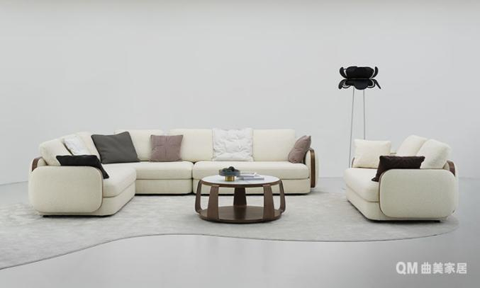“河湾”由曲美家居自主研发,致力于打入新一代高知消费群体,以客厅、餐厅、卧室在内的三大空间为主,打造沙发、茶几、餐桌和床四大品类,通过轻量设计和年轻一代喜爱的极简风造型,将弯曲木工艺作为设计元素,简单自然地融入家具细节。