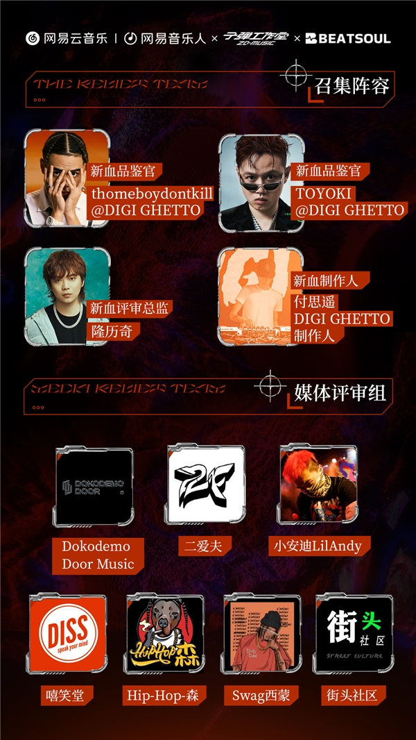 本次赛事特别邀请到Dokodemo Door Music、二爱夫、小安迪LilAndy、嘻笑堂、Hip-Hop-森、Swag西蒙和街头社区组成的媒体评审团,以及网易云音乐平台运营组和子弹工作室组成的平台评审团,合力确保本次大赛的专业度和严谨性。