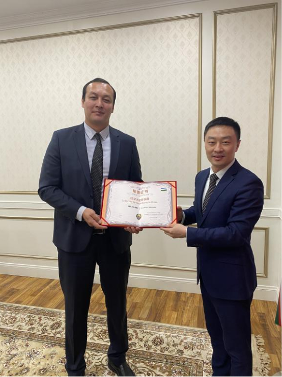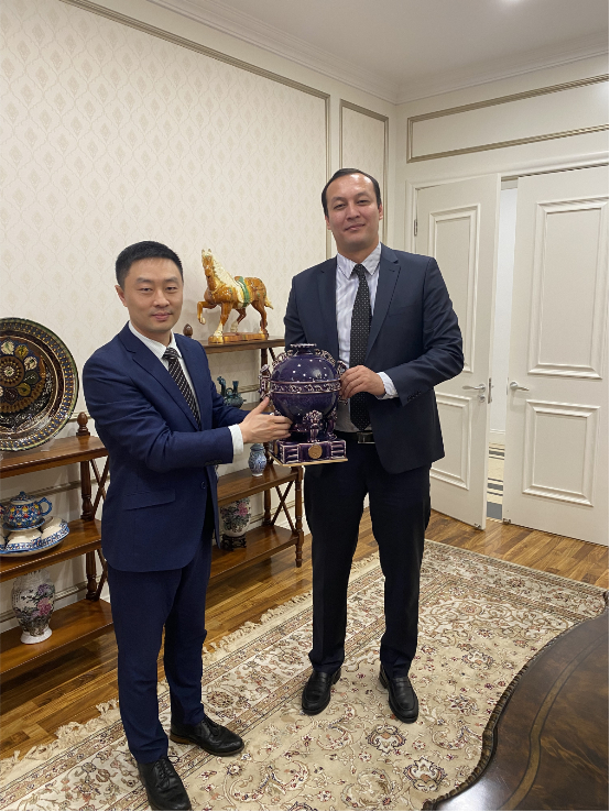 2022年9月15日-16日,在乌兹别克斯坦美丽的丝路古城撒马尔罕迎来了一场盛会。上海合作组织成员国元首理事会第二十二次会议在此召开。今年是上合组织宪章签署20周年和成员国长期睦邻友好合作条约签署15周年,注定是上合组织发展历程中具有标志性意义的一年。站在新的历史起点上,上合组织将继续深化同成员国合作,坚守初心,与时俱进,因势而为,以积极开放的姿态迎接新挑战,推动组织在新起点上实现新跨越,携手构建更加紧密的上合组织命运共同体。2022年9月23日,为纪念上合组织发展迈向新篇章,乌兹别克斯坦驻华大使馆正式收藏国礼《上合樽》,作为时代见证。据悉,《上合樽》由乌兹别克斯坦驻华使馆代表Ibragimov Mansur亲自接收,并颁发收藏证书。
