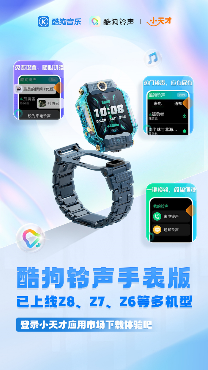 近期,酷狗铃声宣布,继Z8之后,目前已覆盖小天才Z6、Z7等更多的机型,满足更多小用户的定制自己专属铃声的需求。