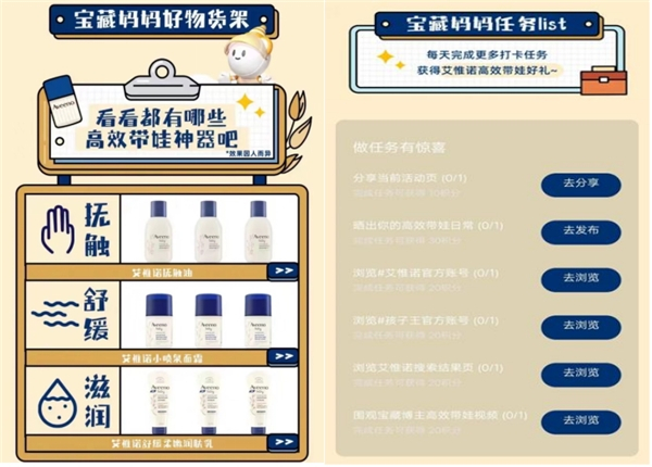 打开小红书搜索#宝藏妈妈高效带娃进入活动页面,可以看到更多新手妈妈分享的宝藏笔记,带#宝藏妈妈高效带娃在小红书发布笔记,参与线上任务还有机会获得艾惟诺高效带娃好礼。宝藏妈妈好物货架,则精选艾惟诺明星产品,满足新手妈妈们抚触、舒缓、滋润三个不同方向的育儿诉求。