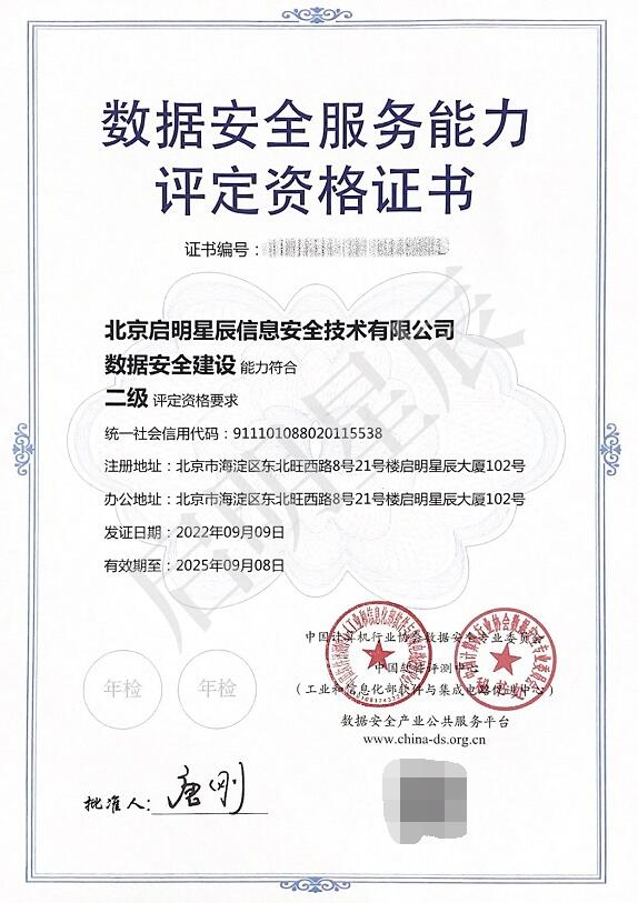 近日,启明星辰经全方位能力评估和专家评审,获得中国软件评测中心和中国计算机行业协会数据安全专业委员会(以下简称“数据安全专委会”)联合颁发的《数据安全服务能力评定资格证书》,数据安全建设能力符合最高等级二级评定资格要求。