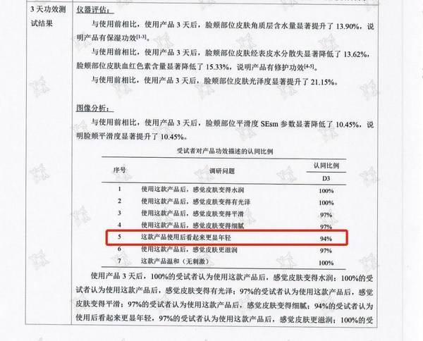 在自评环节,所有的受试者都感觉皮肤变得水润,变得有光泽,产品温和无刺激。97%的受试者感到皮肤变得平滑、细腻、更滋润。94%的受试者更是认同"使用后看起来更显年轻"这个描述。