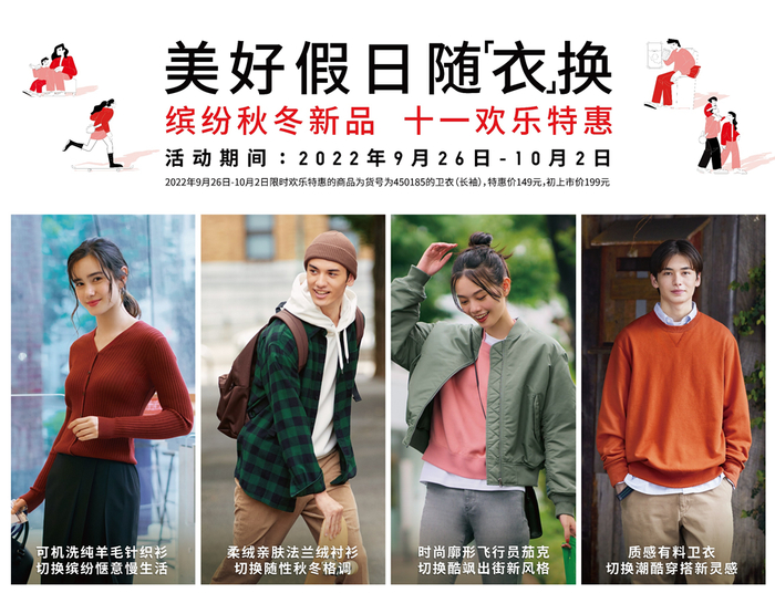 久违国庆假日,是时候放下压力,切换以往紧绷状态,找回舒适自在好心情。洞察消费者假日需求,9月26日起,全球服饰零售知名品牌优衣库开启 美好假日随「衣」换 缤纷秋冬新品,十一欢乐特惠!型实兼备 心动外套系列、缤纷百色 时尚温暖摇粒绒系列,助你切换假日多样风景, 自在感受近郊户外探险乐趣;缤纷柔软 质感针织系列、舒适廓形 牛仔裤系列,助你切换假期自在节奏,畅享宅家追剧、户外郊游的秋日慵懒时光;时尚质感卫衣、大师设计系列,助你切换假日百变风格,尽享扮靓刷街的酷飒和品质休闲感;「格」外有型 法兰绒系列、新经典品质衬衫系列,助你切换假日新鲜玩法,体验亲子阖家欢乐游的愉悦!更多潮流秋冬新品,十一欢乐特惠,限时特惠99元起!国庆佳节,即使远隔异地,也能打破时空界限,送TA一份久违问候。优衣库全新数字储值卡服务“优衣库心衣卡”,购卡送心意,入会享新品,消费享好礼。登录掌上优衣库,搜索“优衣库心衣卡”,购卡后可微信一键转发赠亲友,心意如衣,赠你所爱,共享假日美好!