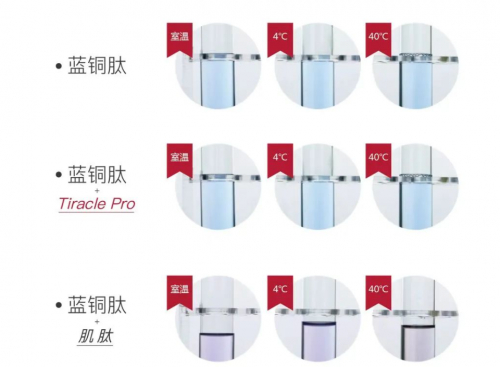 有了对功效的论证,团队仍然希望通过成分的复配来进一步提升和放大功效,力争做到即时和长效功效的兼顾。经过层层筛选排除,团队最终发现蓝铜肽与独家原料双菌发酵成分TIRACLE PRO搭配时具有1+1>2的显著功效。
