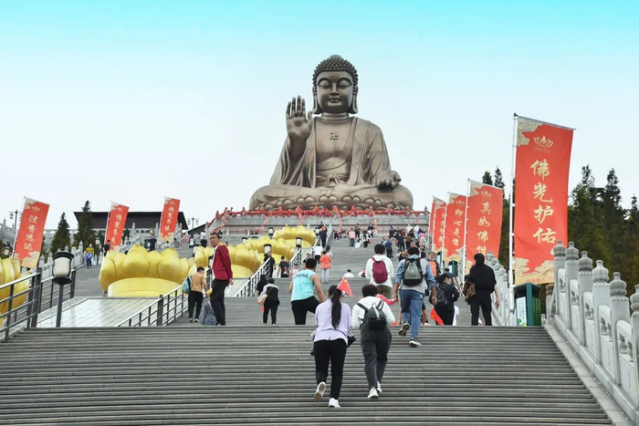 大佛脚下共有360级阶梯,登上大佛,要花费不少的力气。攀爬中,家庭的中生代发挥了中坚作用,大家互相鼓励互相搀扶,向大佛前进。