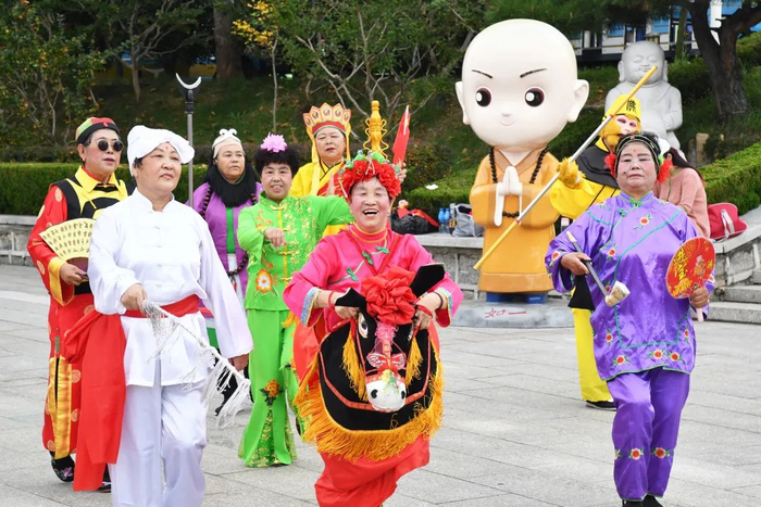 热闹的胶东秧歌表演注重与现场游客的互动,让游客尽兴地观看、参与表演。不仅体现出浓郁的民俗特点,又不失独有的轻快淡然。