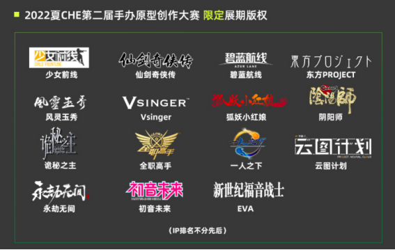 成熟的商业模式和商品化能力,吸引了更多热门IP参与展期授权,包括阴阳师、新世纪福音战士、初音未来、少女前线、仙剑奇侠传、碧蓝航线、东方project、风灵玉秀、Vsinger、狐妖小红娘、诡秘之王、全职高手、一人之下、云图计划、永劫无尽等,为原型师提供更广阔的创作舞台,为原创设计持续打call。