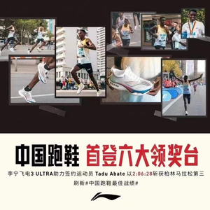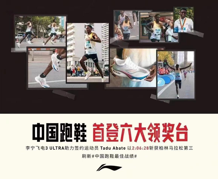 当柏林马拉松季军阿巴特和冠军基普乔格、亚军科里尔携手一同站上领奖台,展示人类运动史上伟大一刻的时候,阿巴特足下的李宁飞电3Ultra跑鞋不仅仅见证了历史,也开创了一个全新的历史:中国运动品牌打破国际巨头对大满贯赛事领奖台的垄断,首次跻身世界巅峰,同时也创造了中国跑鞋的最快纪录。