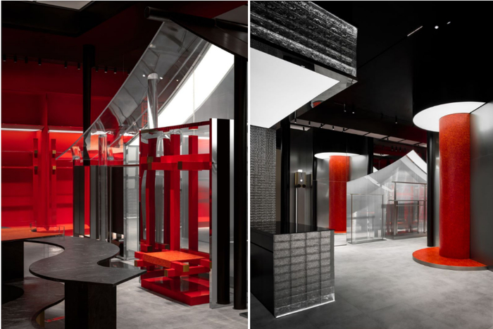 自1968年成立以来,金利来的中文标识一直沿用着创始人曾老先生的手写体,为了更好地传递品牌心系祖国的情怀,“金”字成为了整个空间概念的灵感来源。作为象形文字,“金”本身的形态与中国传统建筑相仿,上至屋顶、下至地基,中间伫立着高大的梁柱,由此演变为金利来创想打造的“家”。在整体空间的设计中,金利来采用中国古代建筑的智慧结晶——榫卯结构,支撑起“家”的屋顶,并将“金”演化的符号延伸至地基,以呈现属于金利来的视觉语言。在材质的选择上,融入五行学说,看似木质的梁柱实则为木皮包裹的金属,打破传统中式建筑的束缚,注入未来的设计理念。此外,馆内设计致敬品牌历史,装潢摆设隐藏着诸多巧思,历年怀旧广告中出现的道具首次被复刻,包括弧形中岛设计、朱丹色的选用,以及印有碧绿色木纹的环保皮革家具,都诠释着“与时空对话”的品牌创意。“我们希望通过这些代表着金利来的元素使整个场馆与品牌的家国情怀有更直接的联系,从而将传统历史与品牌精神化作视觉符号,焕新呈现品牌的传承与突破。”本次场馆的设计师欧敏捷说道。