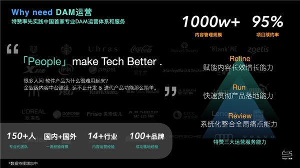 目前,特赞已服务了 200 多家大中型企业,成功帮助阿里巴巴、联合利华、字节跳动、百事、资生堂、宝洁、麦当劳、亨氏、可口可乐、百威、蚂蚁金服、雀巢、腾讯、欧莱雅、达能、中国平安、中金、保时捷、奥迪、Aptar等全球领先品牌搭建内容中台,升级内容战略;已生产了超过 15万 的内容资产并形成千万级的内容资产管理规模,搭建的内容生态已聚集 5万 多个内容创作者。