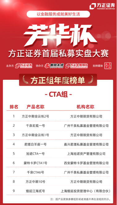 本年度荣获方正组CTA策略前三名的是方正中期期货有限公司旗下“方正中期金云帆2号”、广州千泉私募基金管理有限公司旗下“千泉宏观一号”以及方正中期期货有限公司的“方正中期金云帆1号”。