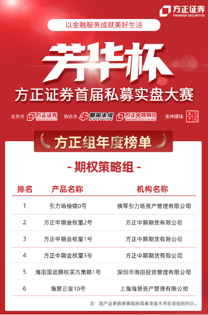 本年度荣获方正组期权策略前三名的是横琴引力场资产管理有限公司旗下“引力场棱镜0号”、方正中期期货有限公司的“方正中期金权量2号”和“方正中期金权量1号”。